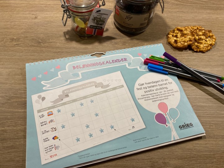 BELØNNINGSKALENDER: En kalender til læring og moro. Skriv inn navn og uke og bruk de medfølgende klistremerkene (eller fantasien) til å sette opp oppgaver for hver uke. Det følger følger med mange klistremerkeark, da også stjerner for utførte oppgaver, hva belønningen skal være vet du kanskje allerede?!