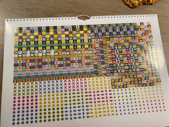 FAMILIEPLANLEGGER A5: Er en kalenderdagbok som jeg tror vil passe ypperlig for en aktiv familie hvor det skal skje mye i løpet av en uke. Trykket kartong, strikk og edge cut. Den har smarte sider for familiens uker gjennom vårsemesteret og høst, samt fint oppsett av uker, hvor familiemedlemmer kan klistre på medfølgende klistremerker for ulike oppgaver gjennom uken, eller skrive selv. Bakerst er det flere sider for notater.