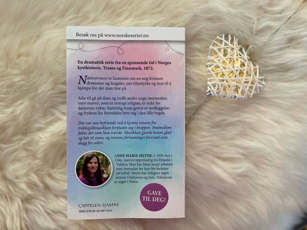 Nord-Norge mot slutten av 1870 årene. Ungdomsårene, da som nå inneholder gjerne drømmer og lengsler. En kraft og mot til å slå igjennom med sine ønsker. Akkurat sånn er det for Aila også! Anne Marie Meyer har tidligere skrevet serieromanene Odelsjenta og Julie, og nå den 19.03.21 er hun klar med sin tredje serieroman, Nattsvermere.