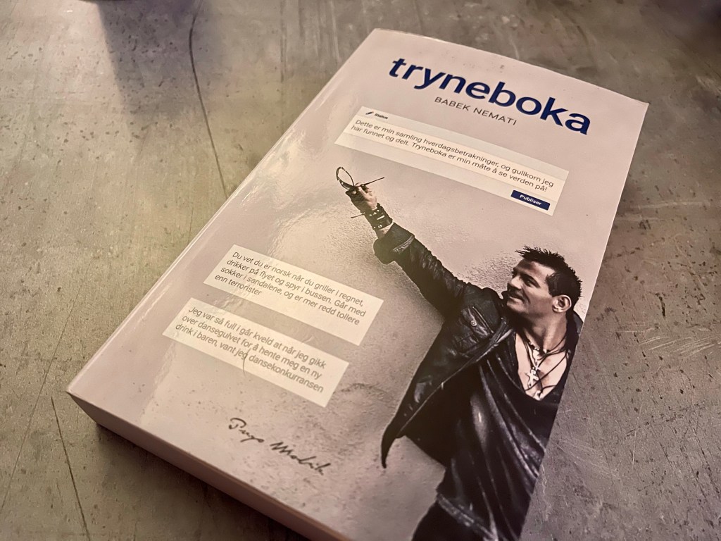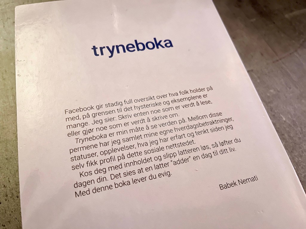 «Dette er min samling hverdagsbetraktninger, og gullkorn jeg har funnet og delt. Tryneboka er min måte å se verden på» Fra bokomslaget v/ Babek Nemati.