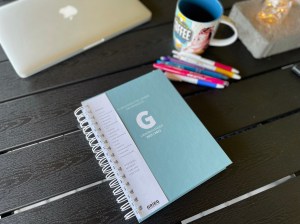 Denne har det samme rene og fine oppsettet, men i tillegg hele 128 ekstra notatsider, og flyttbare skillekort man kan skrive innhold på – og plassere der man ønsker dem. Boken finnes også med blått eller aprikosfarget omslag i butikk.