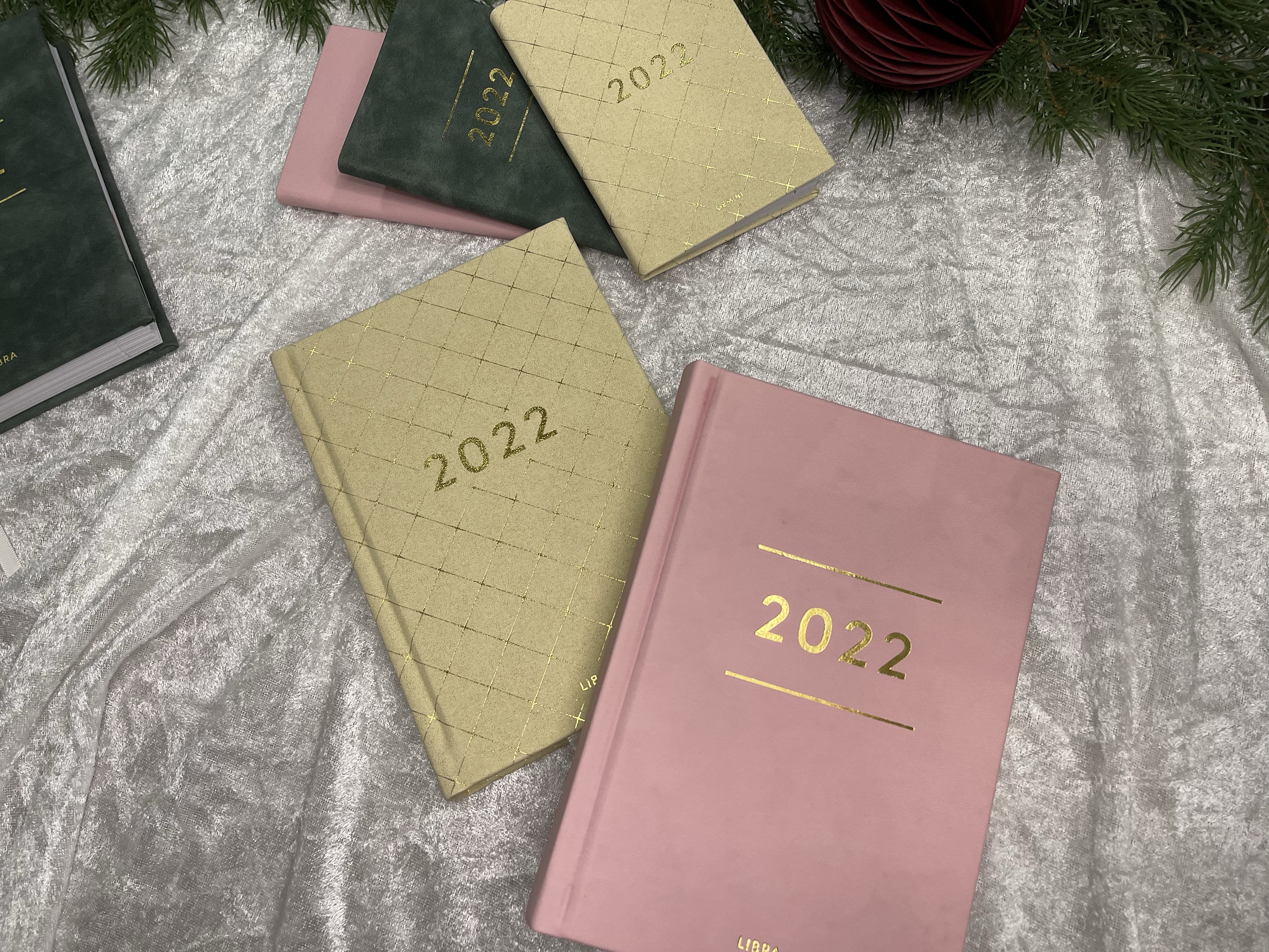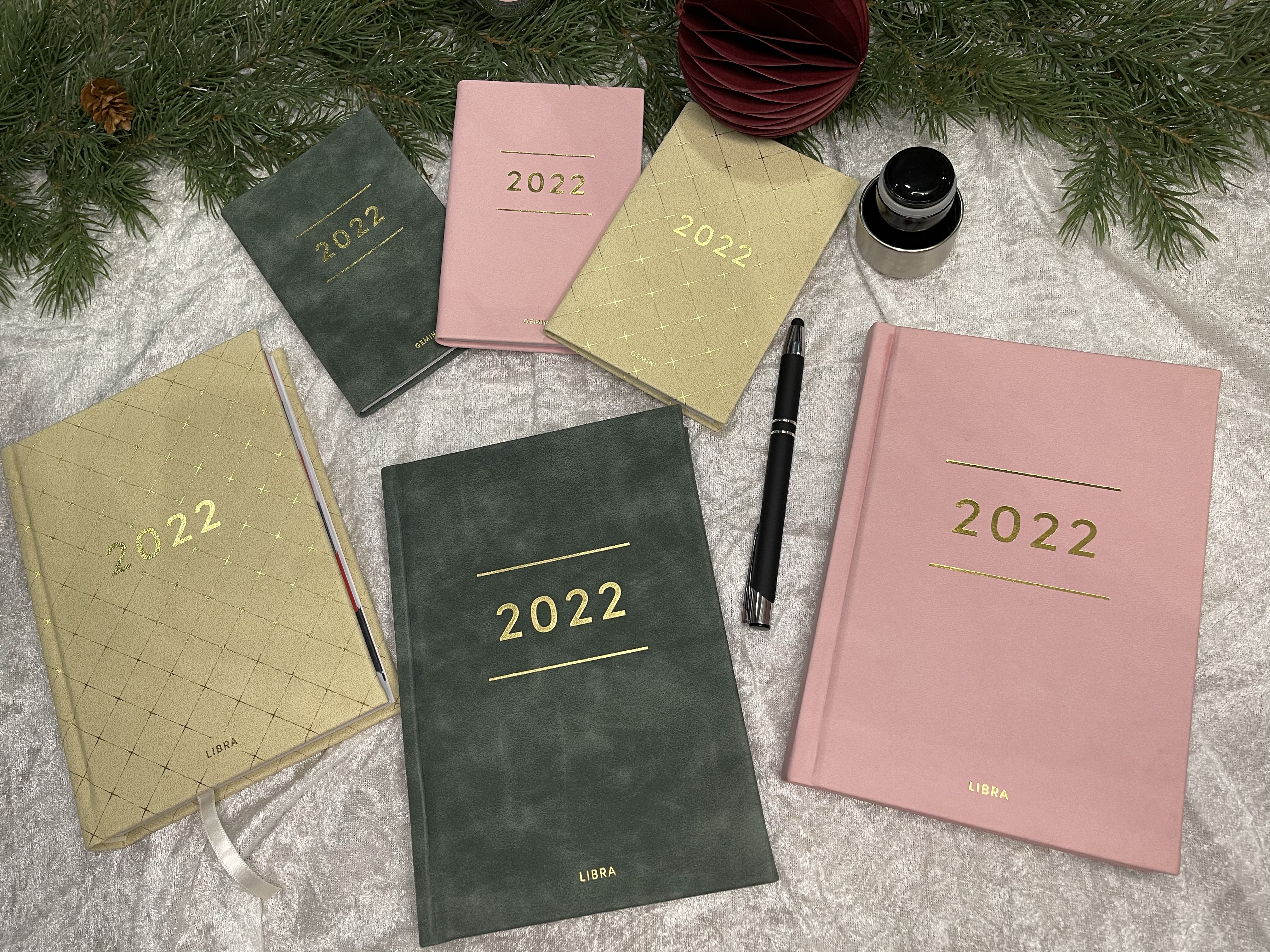 Libra Colore, og Gemini Colore er alle innbundne dagbøker i imitert skinn med gulldetaljer. De har utstansede månedsregistre, helligdagstekster, hjørner å rive av for hver dag nederst, og lesebånd. Finnes i fargene grønn, beige og rosa. Ta en titt på bildene, er de ikke nydelige?