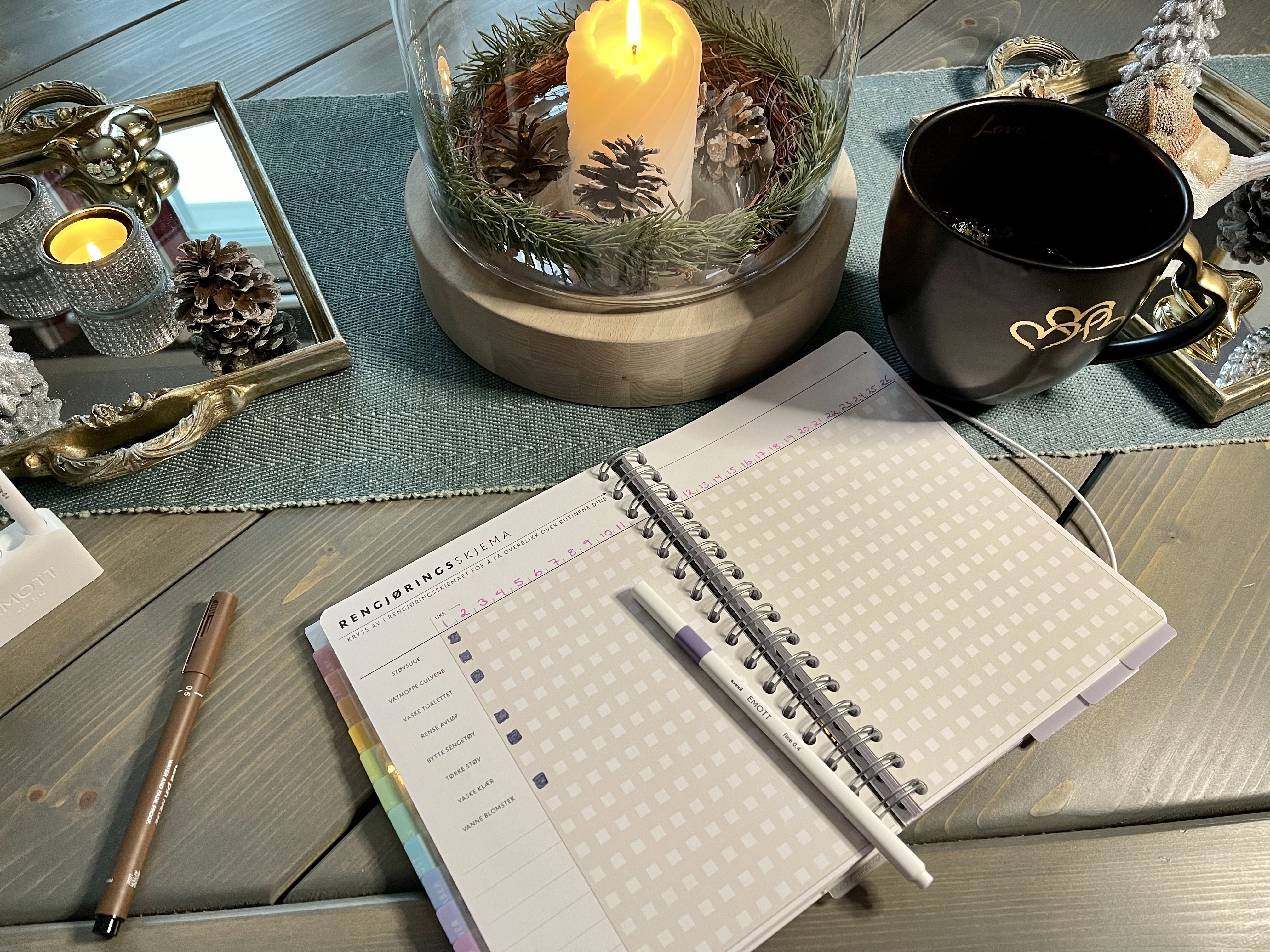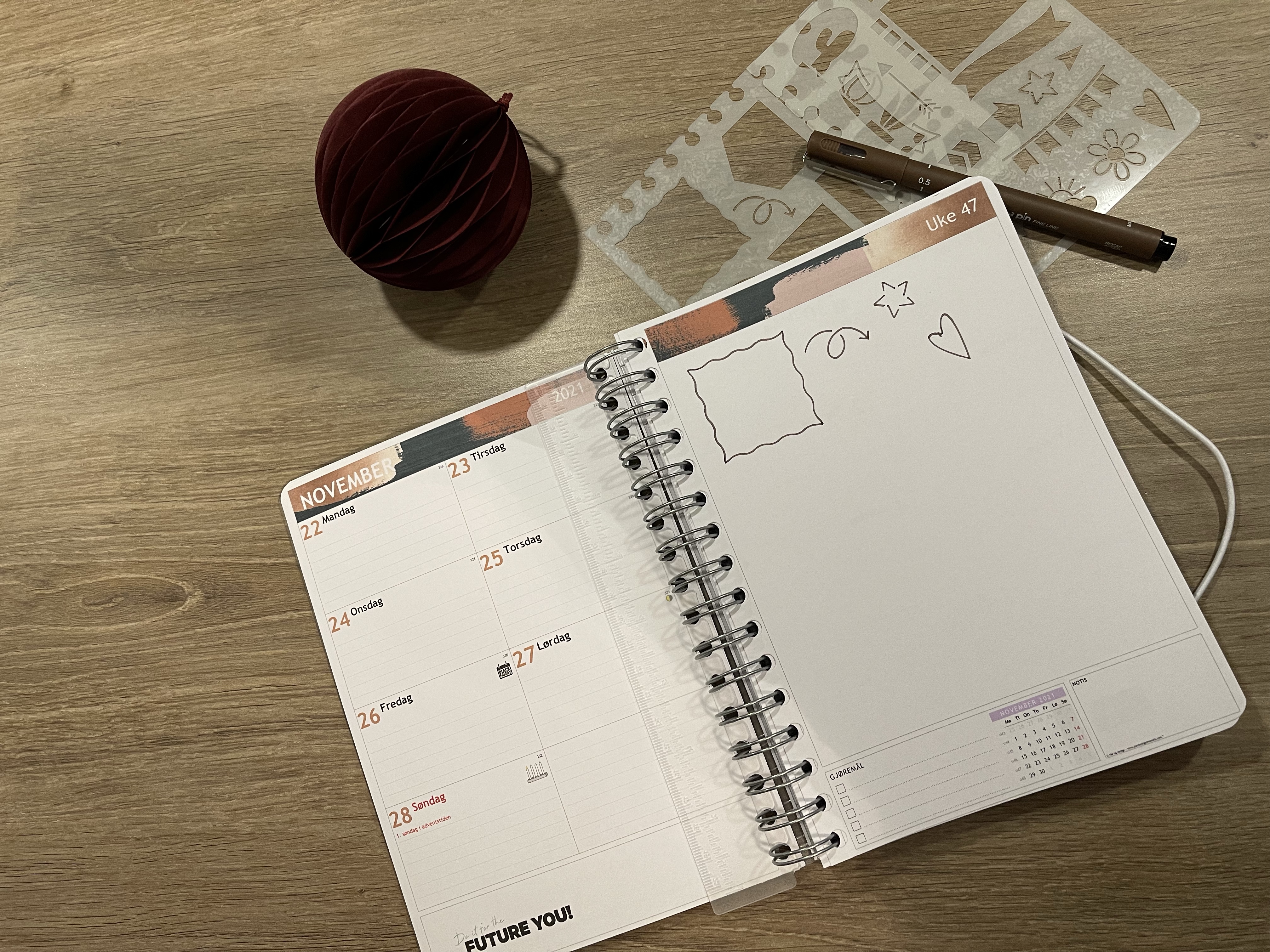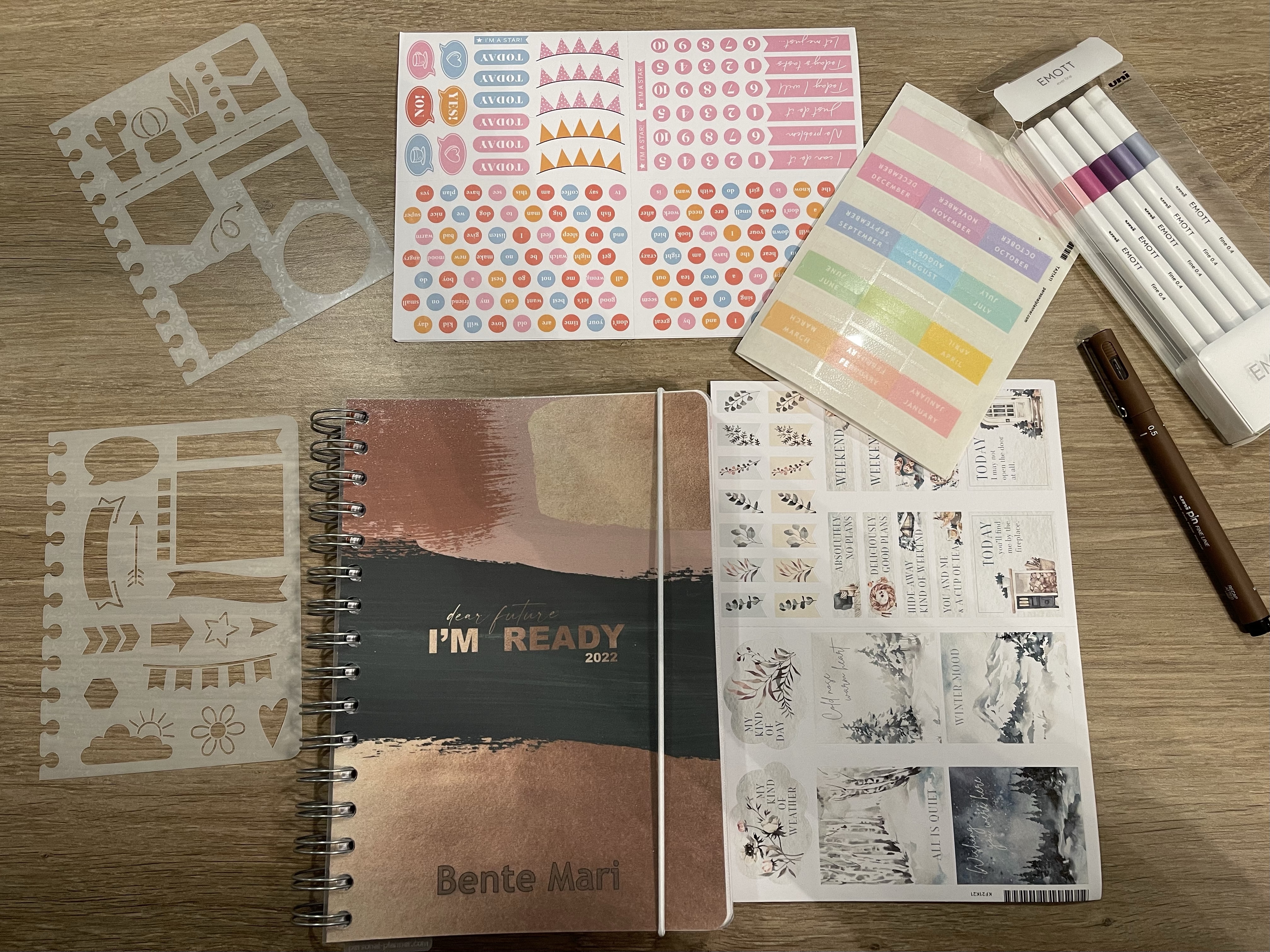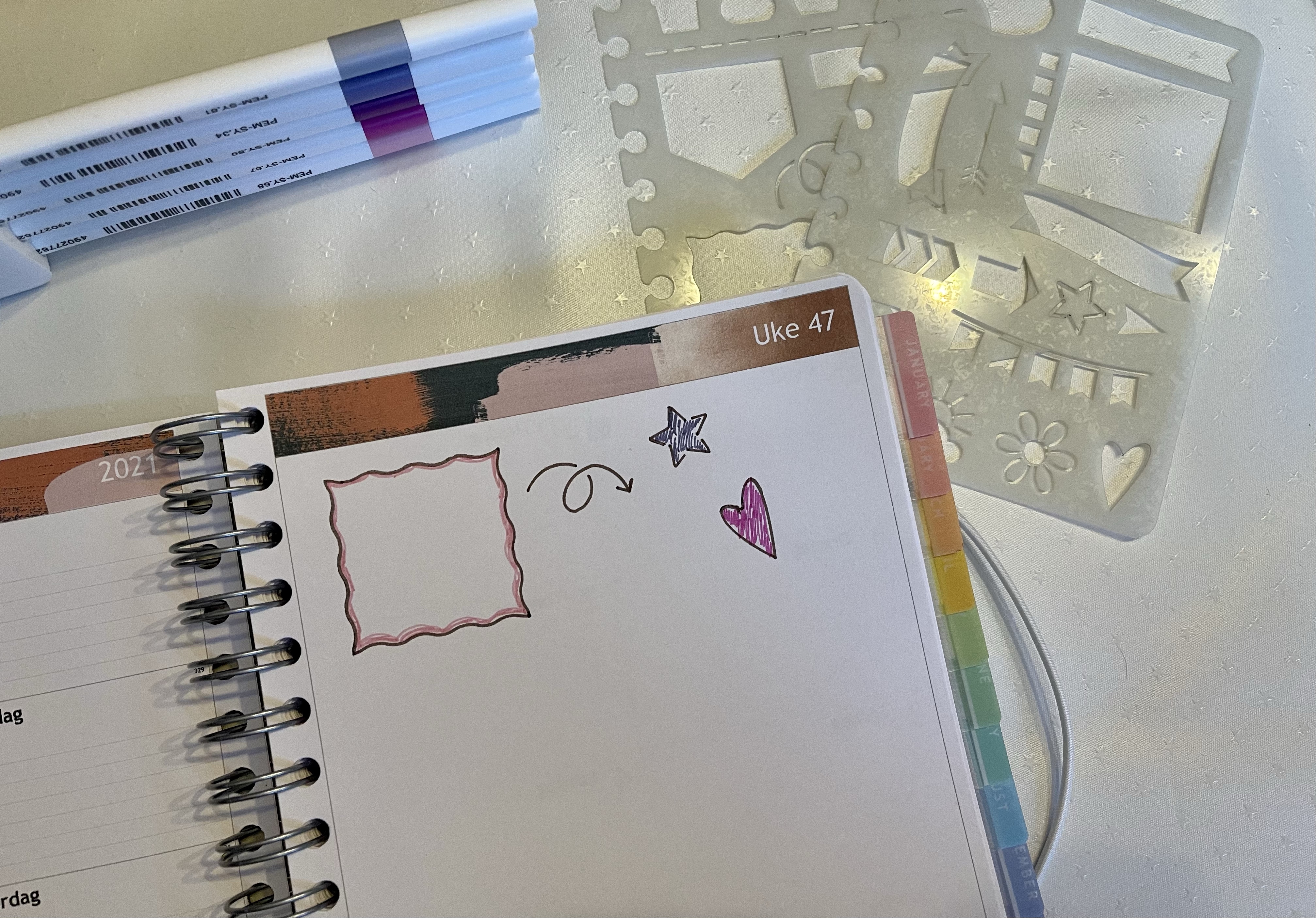 Jeg valgte meg som nevnt litt tilbehør sammen med en kalender i A5 format. Jeg valgte meg sjablonger, vinterens klistremerke-ark, et sett penner, en single penn og indeksfaner, og etter å ha testet litt så kan jeg si at jeg er veldig godt fornøyd med valgene jeg gjorde.
