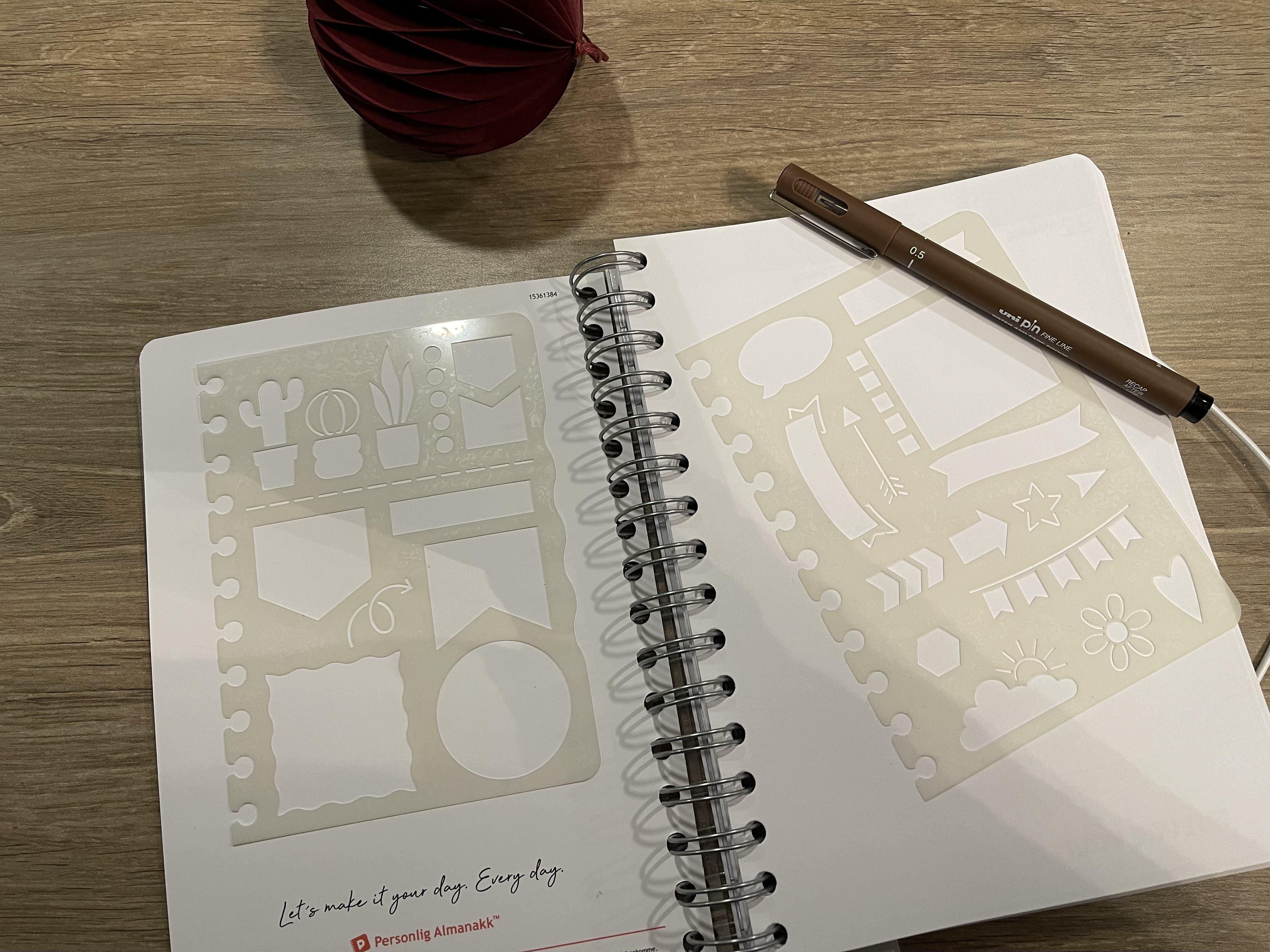Almanakken har et utrolig godt papir. Glatt å stryke over og kjennes tykkere, slik at jeg ikke tenker over at ark kan revne hvis jeg er litt for ivrig. Sjablongene er supre. Litt tynne kanskje, men kjekt at de kan settes innpå spiralen i almanakken. Når jeg tok frem de kom jeg til å tenke på den typen «verktøy» mange av oss hadde i et stort pennal på 90 tallet.