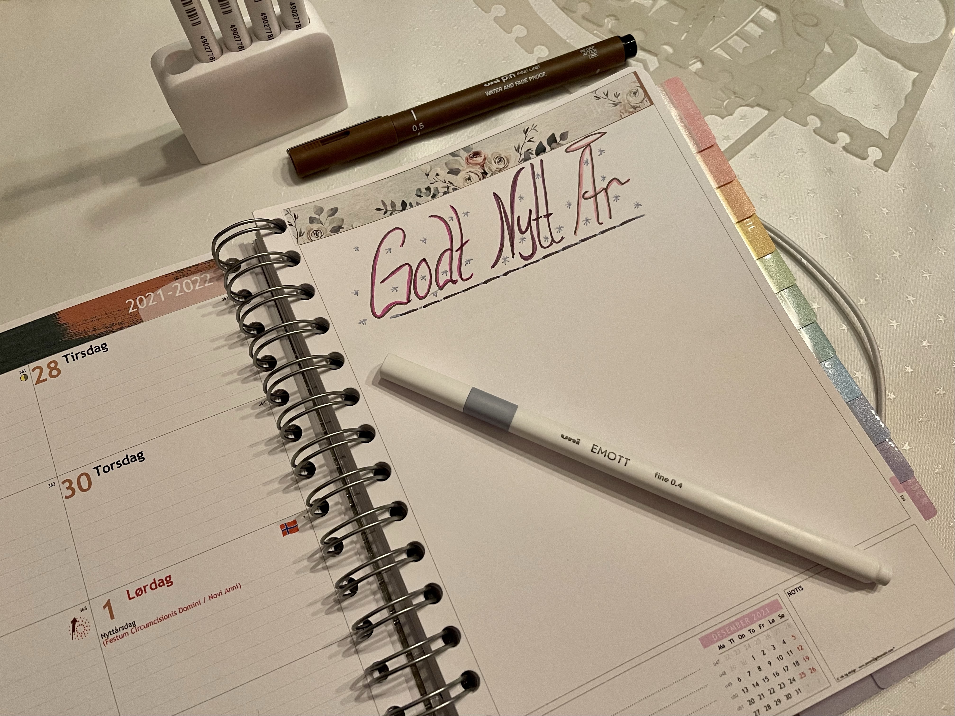 Vinterens klistremerke – ark er det ikke så mye annet å si om enn at det er utrolig fine motiver i vinterens blå og beige toner. Header klistremerket fikk jeg ikke helt til å passe, men det gjorde absolutt ingen ting. Pennene jeg valgte med er veldig gode å skrive med syns jeg. Blekket er godt pigmentert, men siden arkene i almanakken synes å være litt tykkere så trekker de ikke igjennom. Muligheten til å sette på indeksfaner var også et veldig godt tilbehør. Det sitter godt, og greier du, som jeg å sette på den første (eller flere) litt feil – så er det ingen problemer å løsne den og feste på nytt, selv ikke etter en uke eller to. Et veldig godt valg å ta med hvis du liker god oversikt i almanakken din.