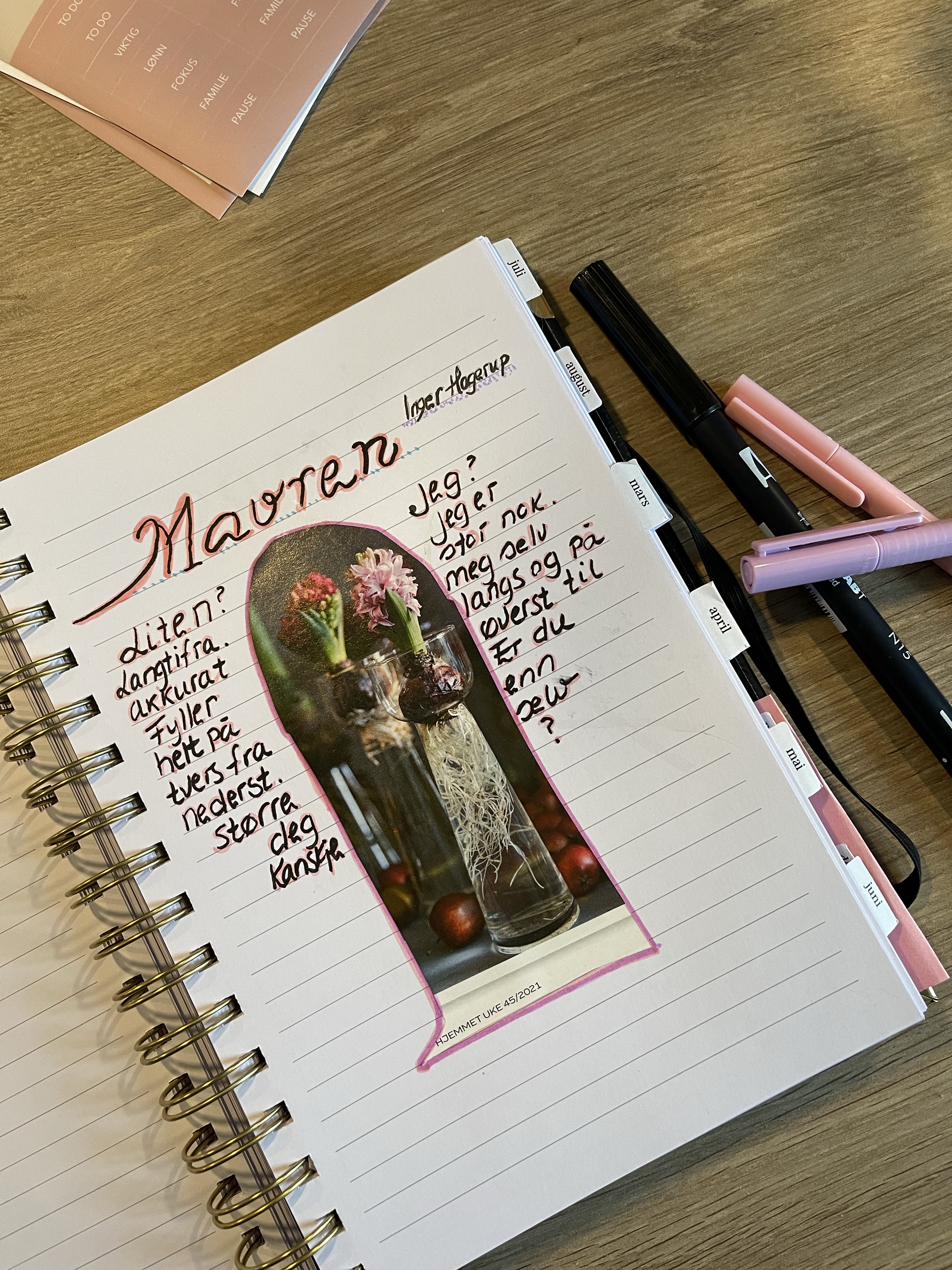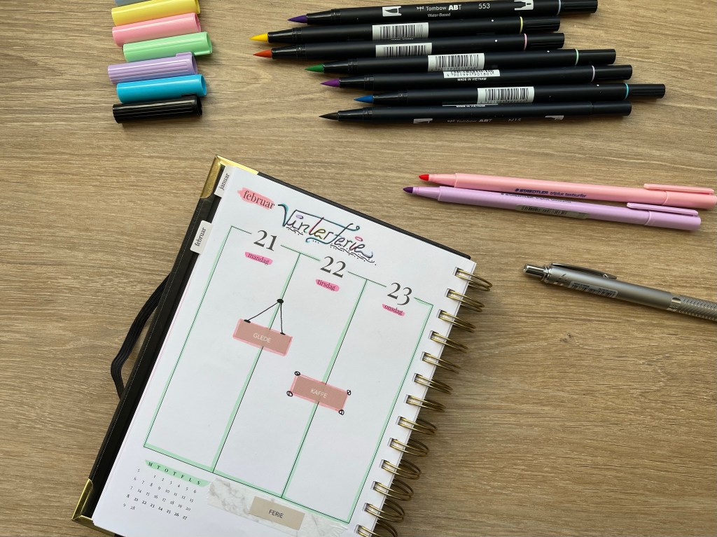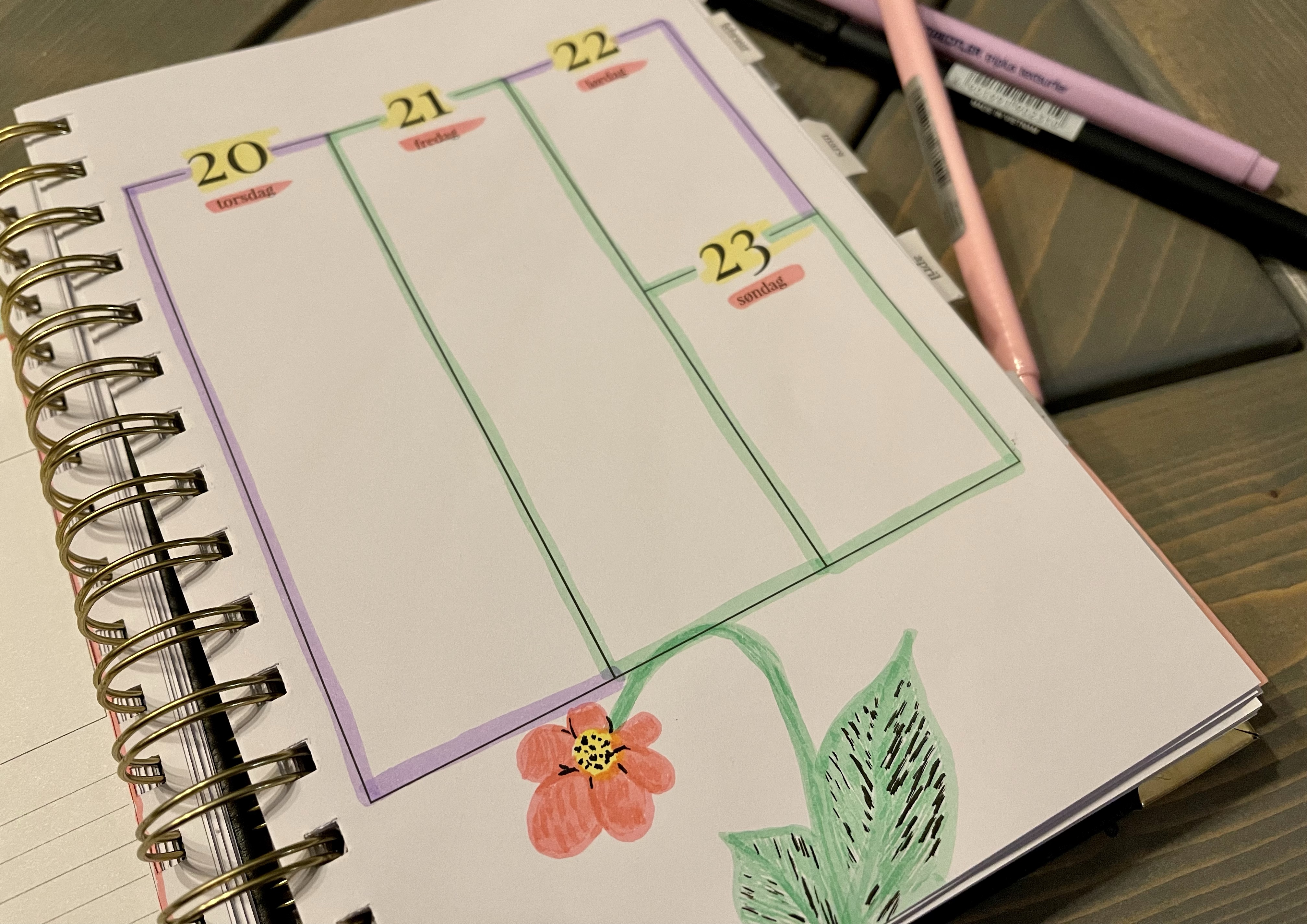 Jeg får lyst til å sette farger på dagene, lyst til å klistre inn ting på sidene, skrible unødvendige notater eller lage fargerike kruseduller – bare for å dekorere og gjøre arkene enda finere, og det håper jeg du også har fått inspirasjon til nå.