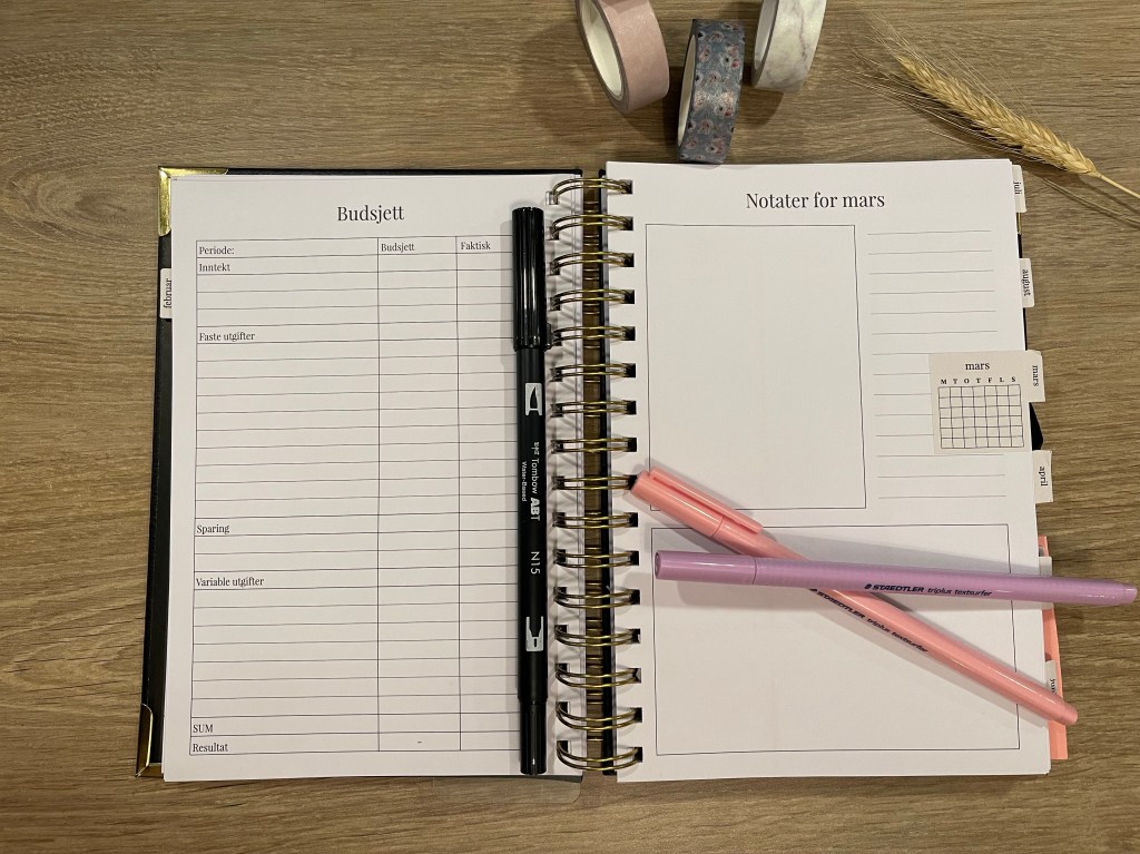 Budsjett-siden og eventuelt utformingen av notatsiden som innleder hver måned er vel de to sidene man kanskje kan ha flest bemerkninger rundt. Der er det vel så individuelt som det får blitt hva man personlig kunne tenkt seg. Aveluna har valgt budsjett – og det er jo kjekt nok det, men jeg kunne nok tenkt meg en blank side der – og at Aveluna heller tilpasser størrelsen på blokkene man kan kjøpe utenom, eller designer flere – til en størrelse som kan limes inn på denne siden, og jeg vet nok hva slags blokk(er) jeg kunne tenkt meg å ha designet for å klistre inn der 😉 Tenk om det da, og kanskje enda mer nyttig tilbehør.. Ja, jeg har og får en del tanker og ideer når jeg sitter med en planlegger.
