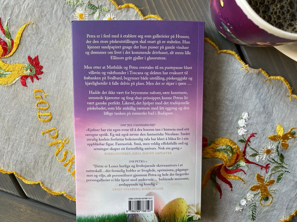 Det er ikke lengre stille og «kjedelig» rundt Petra, og skal vi tro omslagsteksten til Petra Pettersens perfekte påske så blir det ikke noe roligere fremover heller. Det ligger an til både ferietur, og påskeutstilling i galleriet, med barnebarn og elskere «på slep.» Eggnog, og påskeeggjakt.