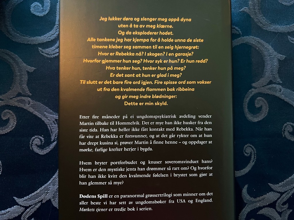 Tidligere i sommer kom den, endelig – del 3 i Anne Elvedal’s ungdoms-trilogi, Dødens Spill. De to første; Dødens spill, og Den sorte bruden anbefales absolutt å leses først, for så å kunne runde av alt som har skjedd i løpet av denne paranormale grøssertrilogien med Mørkets tjener.